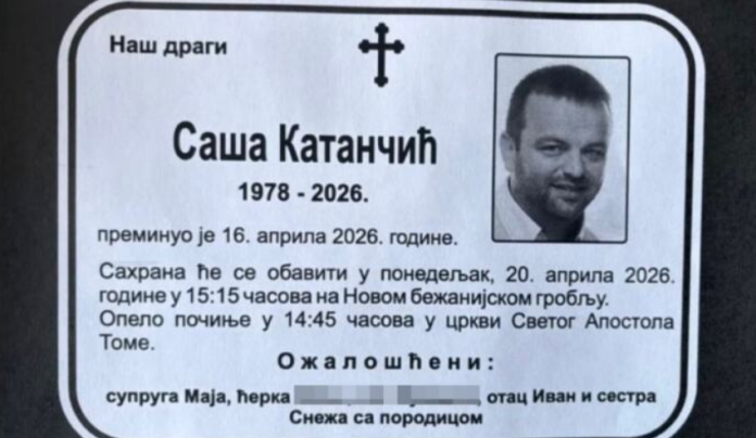 – Naš dragi Saša Katančić preminuo je 16. aprila 2026. godine. Sahrana će se obaviti u ponedeljak, 20. aprila 2026. godine u 15:15 časova na Novom bežanijskom groblju. Opelo počinje u 14.45 časova u crvki Svetog Apostola Tome. Ožalošćeni: supruga Maja, deca, otac Ivan i sestra Sneža sa porodicom – pisalo je na umrlici.